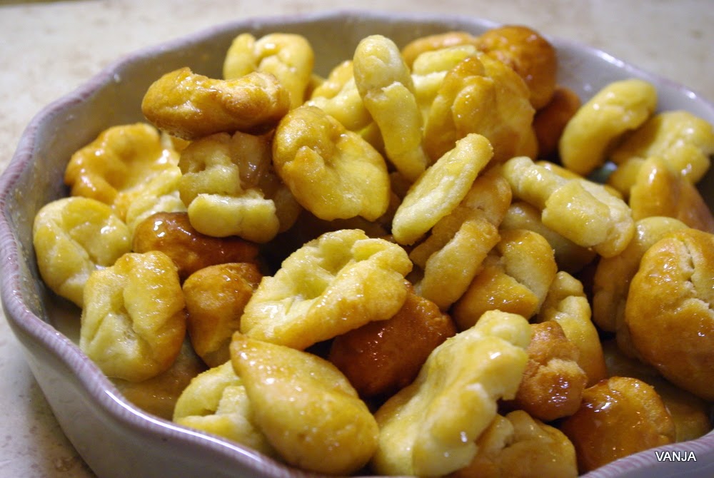 Za preliv sem zmešala vse sestavine in jih segrela, tako da se je sladkor raztopil in da sem dobila tekoč sirup. Preliv sem nekoliko ohladila in ga tik pred serviranjem prelila preko testenih kroglic - struffol-ov.